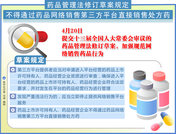 新華社北京4月20日電(記者趙文君)20日提交十三屆全國(guó)人大常委會(huì)審議的藥品管理法修訂草案,加強(qiáng)規(guī)范網(wǎng)絡(luò)銷(xiāo)售藥品行為,明確不得通過(guò)藥品網(wǎng)絡(luò)銷(xiāo)售第三方平臺(tái)直接銷(xiāo)售處方藥。