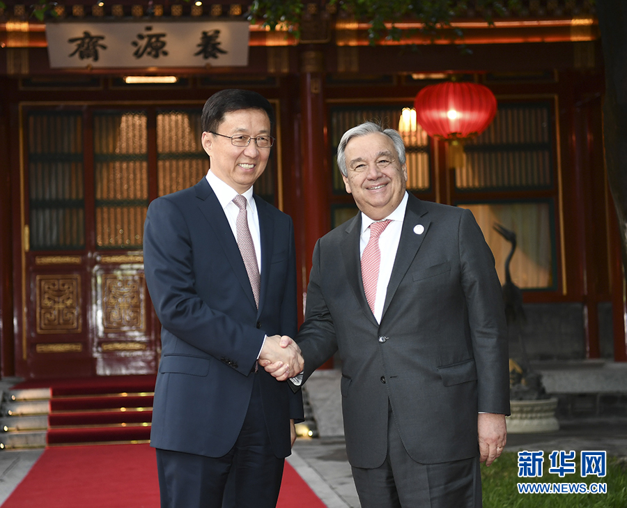 4月27日,中共中央政治局常委、國務(wù)院副總理韓正在北京釣魚臺(tái)國賓館會(huì)見聯(lián)合國秘書長古特雷斯。新華社記者 謝環(huán)馳 攝