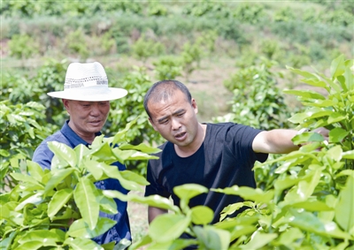 徐剛(右)在地里查看掛果情況 攝影記者 陶軻