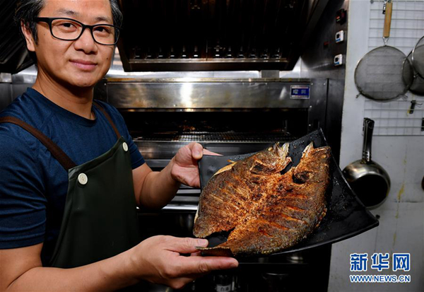 臺(tái)北市“一品言”餐館老板兼大廚劉添吉在展示烤魚(yú)(4月24日攝)。新華社記者 張國(guó)俊 攝