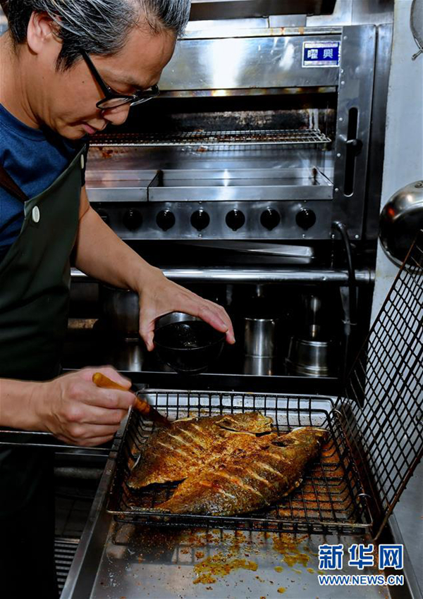 臺(tái)北市“一品言”餐館老板兼大廚劉添吉在加工烤魚(yú)(4月24日攝)。新華社記者 張國(guó)俊 攝