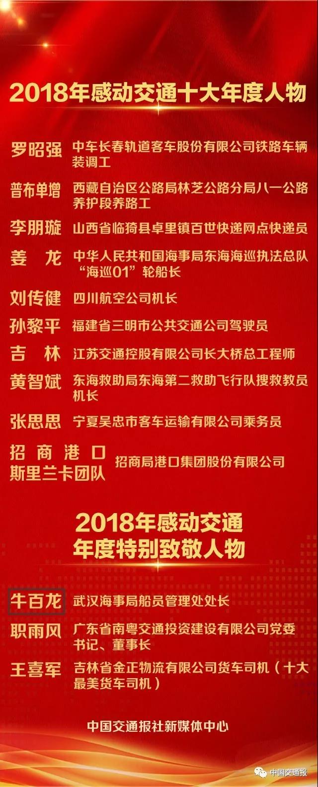 另外,將青春和生命奉獻(xiàn)給海事交通事業(yè)的武漢海事局船員管理處處長牛百龍;胸懷大愛,積極踐行“大道為公”理念的廣東南粵交通投資建設(shè)有限公司黨委書記、董事長職雨風(fēng);400萬公里安全駕駛、細(xì)心工作、熱心助人的吉林省物流貨車司機(jī)王喜軍榮獲“2018年感動交通年度特別致敬人物”稱號。