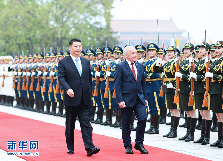 4月29日,國家主席習(xí)近平在北京人民大會(huì)堂同瑞士聯(lián)邦主席毛雷爾舉行會(huì)談。這是會(huì)談前,習(xí)近平在人民大會(huì)堂東門外廣場(chǎng)為毛雷爾舉行歡迎儀式。 新華社記者 謝環(huán)馳 攝