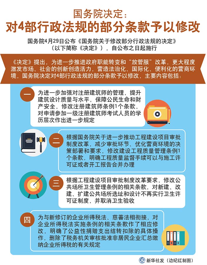 為進(jìn)一步推進(jìn)政府職能轉(zhuǎn)變和“放管服”改革,更大程度激發(fā)市場(chǎng)、社會(huì)的創(chuàng)新創(chuàng)造活力,營(yíng)造法治化、國(guó)際化、便利化的營(yíng)商環(huán)境,國(guó)務(wù)院對(duì)涉及的行政法規(guī)進(jìn)行了清理。經(jīng)過(guò)清理,國(guó)務(wù)院決定:對(duì)4部行政法規(guī)的部分條款予以修改。