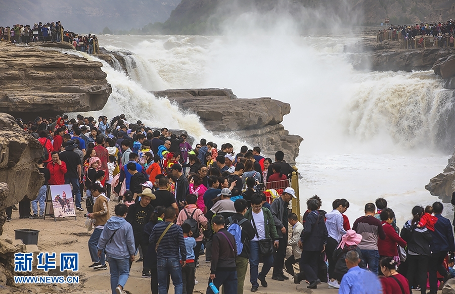 5月3日,游人在位于陜西宜川縣的黃河壺口瀑布景區(qū)游覽。 新華社發(fā)(蘭華 攝)