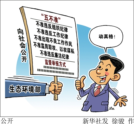 新華社北京5月16日電(記者高敬)記者從生態(tài)環(huán)境部獲悉,此前曾有環(huán)境執(zhí)法人員在專項(xiàng)督查或檢查期間,發(fā)生違反廉潔紀(jì)律的問(wèn)題。為嚴(yán)明紀(jì)律,中央紀(jì)委國(guó)家監(jiān)委駐生態(tài)環(huán)境部紀(jì)檢監(jiān)察組5月16日發(fā)布公告,向社會(huì)公開了生態(tài)環(huán)境部污染防治攻堅(jiān)戰(zhàn)強(qiáng)化監(jiān)督工作“五不準(zhǔn)”,并公布紀(jì)律作風(fēng)監(jiān)督舉報(bào)方式。