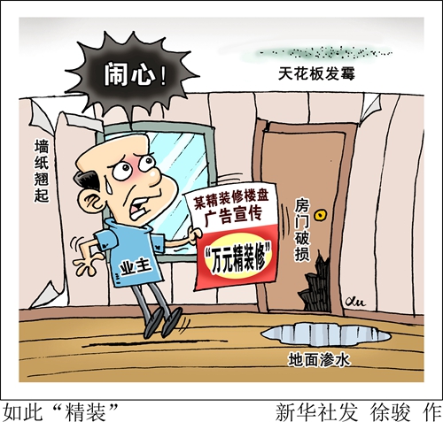 “新華視點”記者調(diào)查發(fā)現(xiàn),事實上所謂“萬元精裝修”的實際標準僅為幾百元,“名牌產(chǎn)品”實為不知名小工廠生產(chǎn)的。部分開發(fā)商一味追求壓縮成本,導致裝修質(zhì)量問題頻發(fā)。近日,住建部辦公廳發(fā)布通知,在全國范圍內(nèi)開展建筑市場和工程質(zhì)量安全監(jiān)督執(zhí)法檢查。