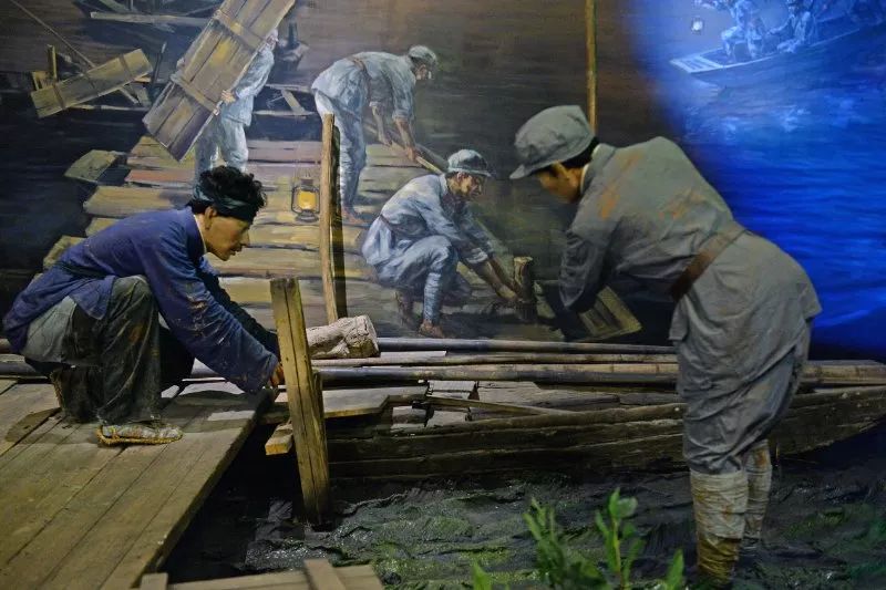 于都縣中央紅軍長征出發(fā)紀(jì)念館中蘇區(qū)群眾鋪設(shè)浮橋場景。新華社記者 萬象 攝