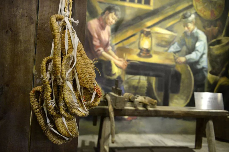 在于都縣中央紅軍長征出發(fā)紀(jì)念館內(nèi)展示的草鞋和制作草鞋的工具。新華社記者 萬象 攝