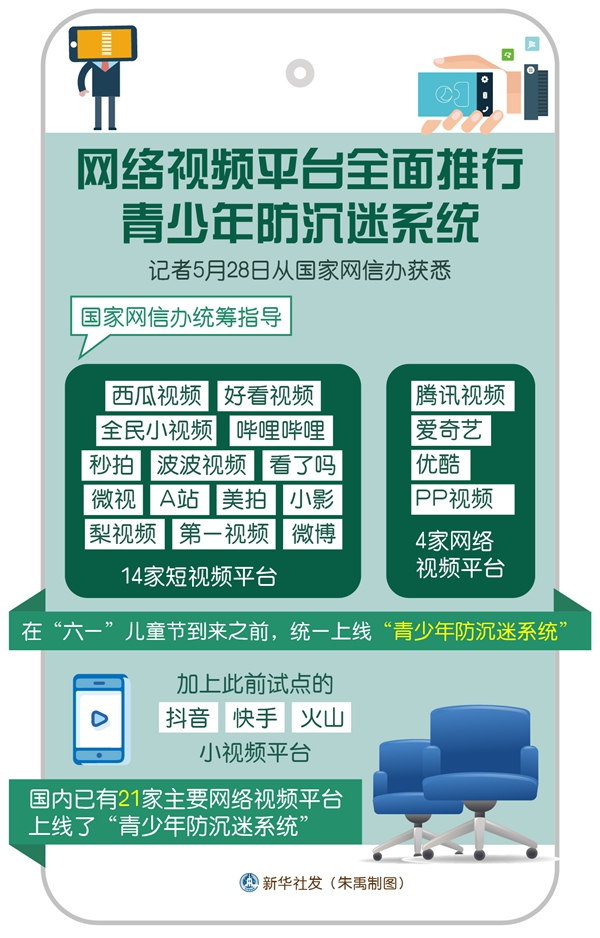 新華社北京5月28日電(記者余俊杰)記者28日從國(guó)家網(wǎng)信辦獲悉,國(guó)家網(wǎng)信辦統(tǒng)籌指導(dǎo)西瓜視頻、好看視頻、全民小視頻、嗶哩嗶哩、秒拍、波波視頻、看了嗎、微視、A站、美拍、小影、梨視頻、第一視頻、微博等14家短視頻平臺(tái),以及騰訊視頻、愛(ài)奇藝、優(yōu)酷、PP視頻等4家網(wǎng)絡(luò)視頻平臺(tái),在“六一”兒童節(jié)到來(lái)之前,統(tǒng)一上線“青少年防沉迷系統(tǒng)”。