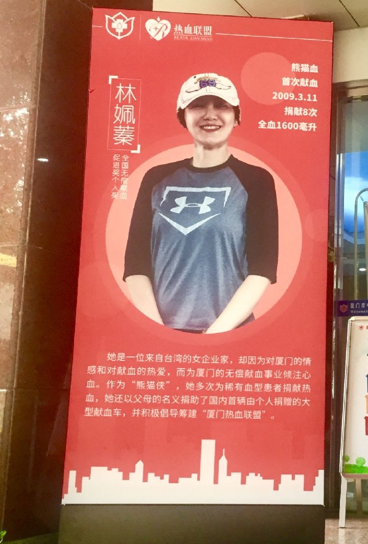 廈門市中心血站展板上宣介的是女臺(tái)商林姵蓁。她是Rh陰性血,這種血型因稀有而被稱為“熊貓血”。來(lái)自臺(tái)北的林姵蓁對(duì)無(wú)償獻(xiàn)血有一份執(zhí)著和擔(dān)當(dāng),這源于父親獻(xiàn)血幾十次的身教。她志愿成為無(wú)償為他人捐獻(xiàn)“熊貓血”的“熊貓俠”,在臺(tái)灣每次接到求助電話都會(huì)第一時(shí)間趕去獻(xiàn)血。