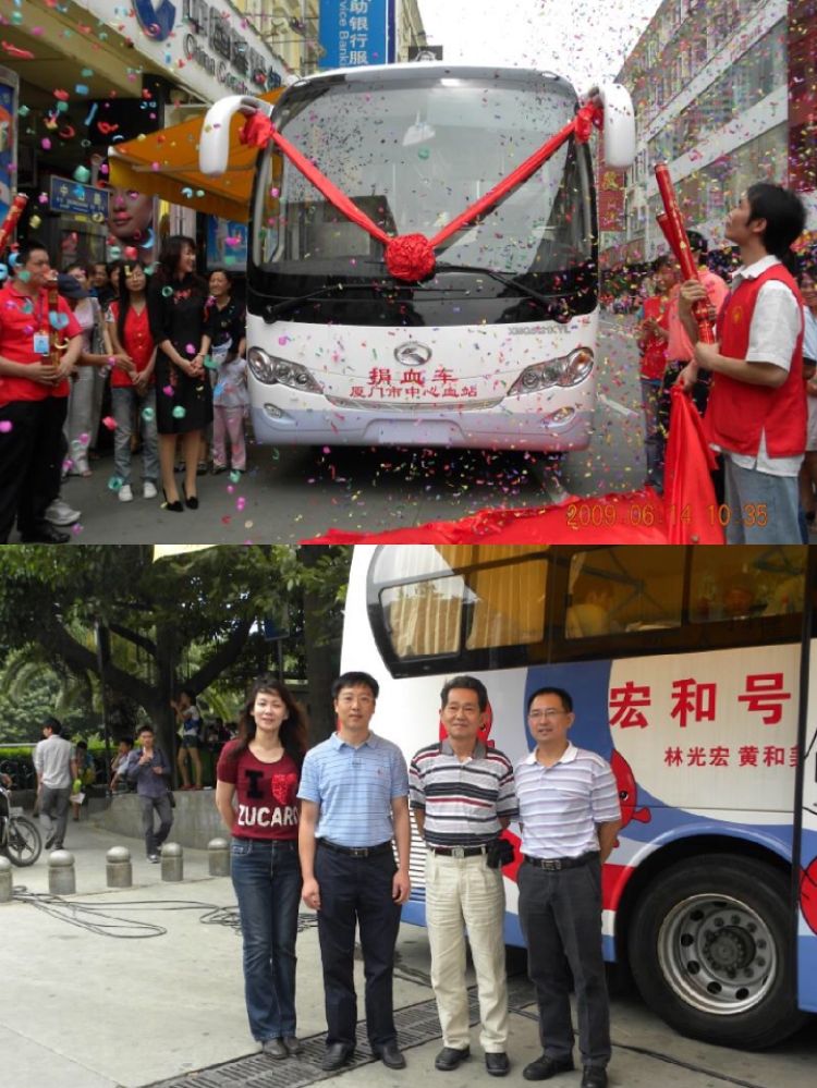上圖:廈門臺(tái)商林姵蓁捐贈(zèng)了大型獻(xiàn)血車。下圖:林姵蓁(左一)和爸爸(左三)在“宏和號(hào)”獻(xiàn)血車旁合影留念。(受訪者供圖)