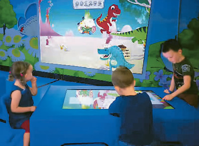 陸浩川團(tuán)隊的人機(jī)交互產(chǎn)品如今已銷往全球20多個國家。圖為兒童正在交互屏幕前玩得不亦樂乎。(受訪者供圖)
