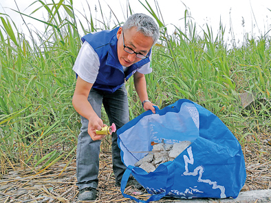 劉永龍在海灘撿垃圾。