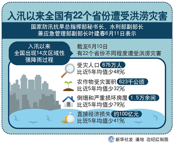 截至6月10日,農(nóng)作物受災(zāi)面積623千公頃,比近5年均值少32%;倒塌和嚴(yán)重?fù)p壞房屋1.5萬(wàn)余間,比近5年均值少79%;直接經(jīng)濟(jì)損失約100億元,比近5年均值少41%。