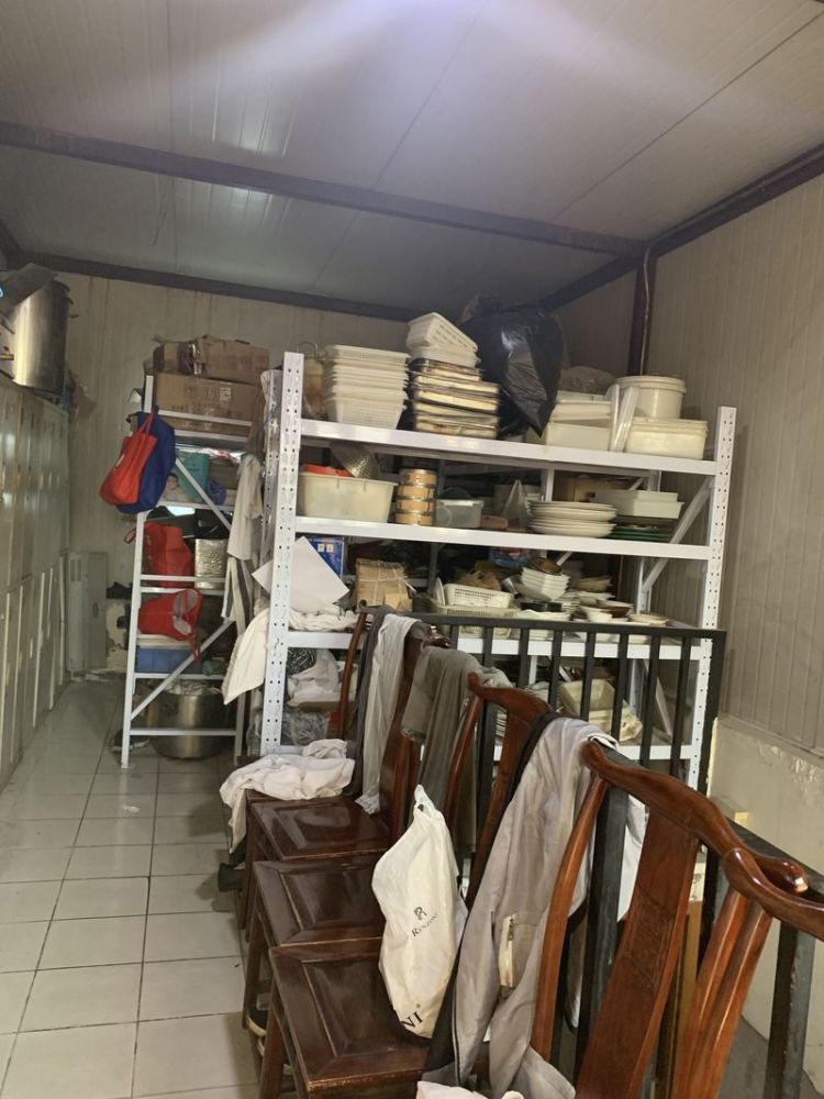 致美齋三樓餐具倉庫同時為員工更衣室,餐具與員工衣物堆放在一起。圖片來源:新華社客戶端