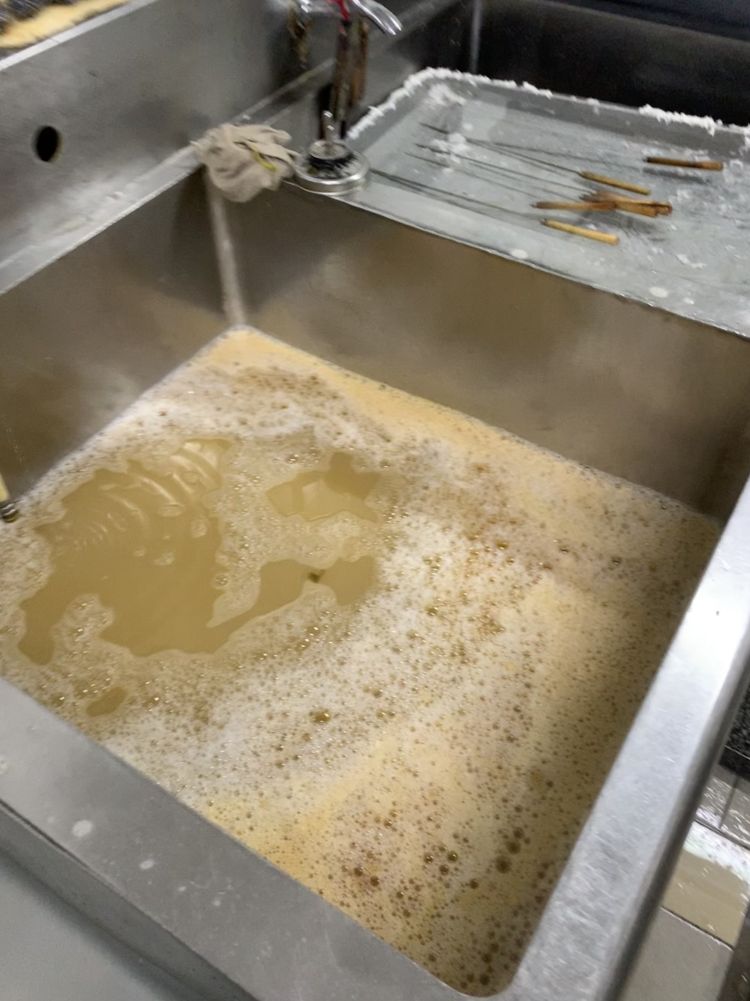 一樓洗碗間,已經(jīng)被油污污染發(fā)黃的洗潔精水池。圖片來源:新華社客戶端