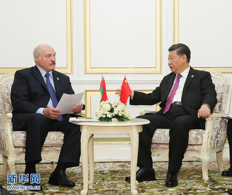 6月14日,國家主席習(xí)近平在比什凱克會見白俄羅斯總統(tǒng)盧卡申科。 新華社記者 丁林 攝