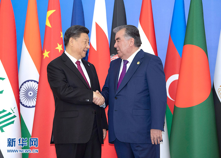 6月15日,亞洲相互協(xié)作與信任措施會議第五次峰會在塔吉克斯坦首都杜尚別舉行。國家主席習(xí)近平出席峰會并發(fā)表重要講話。這是習(xí)近平抵達納烏魯茲宮迎賓廳,受到塔吉克斯坦總統(tǒng)拉赫蒙熱情迎接。 新華社記者 沙達提 攝