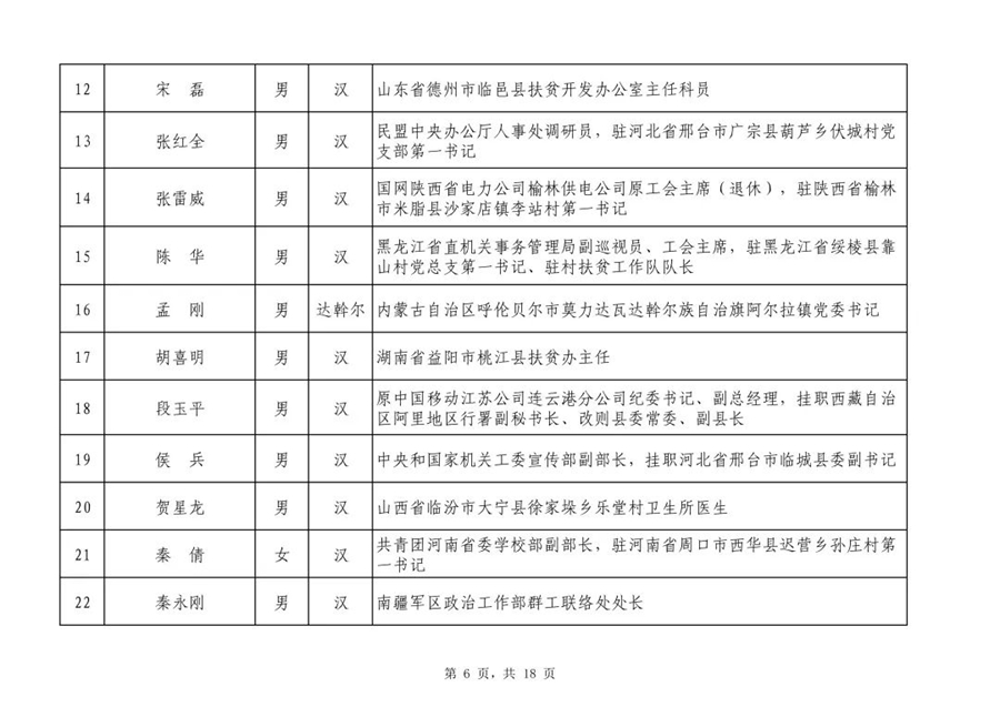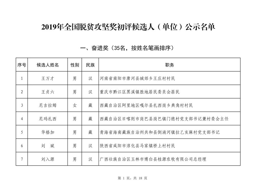 根據(jù)國(guó)務(wù)院扶貧開(kāi)發(fā)領(lǐng)導(dǎo)小組印發(fā)的《2019年全國(guó)脫貧攻堅(jiān)獎(jiǎng)評(píng)選表彰工作方案》,經(jīng)全國(guó)脫貧攻堅(jiān)獎(jiǎng)評(píng)選委員會(huì)初次評(píng)審,以下140名人選和59個(gè)單位作為2019年全國(guó)脫貧攻堅(jiān)獎(jiǎng)初評(píng)候選人(單位),現(xiàn)予以公示。