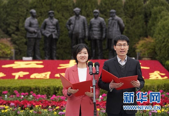 3月28日在西柏坡,記者代表在“壯麗70年·奮斗新時(shí)代”大型主題采訪活動(dòng)啟動(dòng)儀式上宣讀倡議。新華社記者 邢廣利 攝
