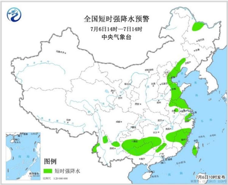 預計7月6日14時至7日14時,黑龍江北部、河北東北部、山東中部、安徽北部、江蘇中北部等地的部分地區(qū)將有8-10級雷暴大風或冰雹天氣,局地將出現(xiàn)極端雷暴大風,瞬時風力可達10級以上;黑龍江北部、遼寧西部、河北東部、北京東部、天津、山東中部、安徽東北部、江蘇中北部、云南西部和北部、貴州南部、湖南中南部、江西中部、浙江北部和南部、福建中北部、廣西北部以及廣東北部等地的部分地區(qū)將有短時強降水,小時雨量20-50毫米,局地可達70毫米以上。