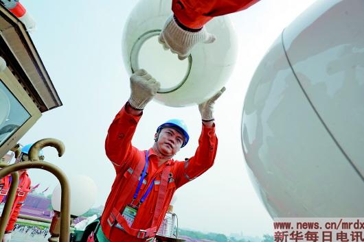 升降車抬起,卸下燈球、高壓氣槍清除污物、檢查線路和器件、清洗燈球、安裝燈泡……華燈班隊員們動作嫻熟、配合默契,儼然一條空中的流動生產(chǎn)線。