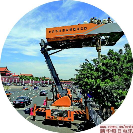 56攝氏度!這是長安街華燈作業(yè)車上的溫度。7月的北京熱浪襲人,下午2點,記者來到天安門廣場東側的華燈下,國家電網(wǎng)北京電力華燈班的第五任班長陳春光,正在和隊員們進行當天第10基華燈的清洗工作。當天,天安門廣場的地面溫度達到50攝氏度。