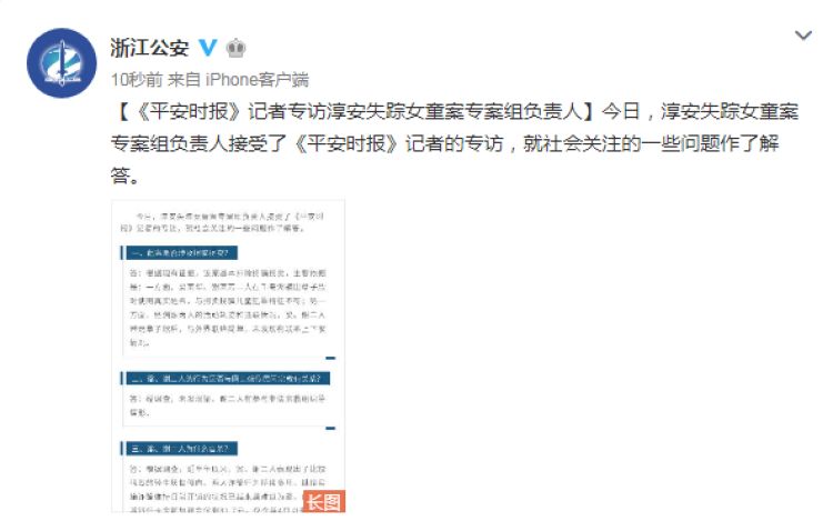 今日,淳安失蹤女童案專案組負(fù)責(zé)人接受了《平安時(shí)報(bào)》記者的專訪,就社會(huì)關(guān)注的一些問題作了解答。