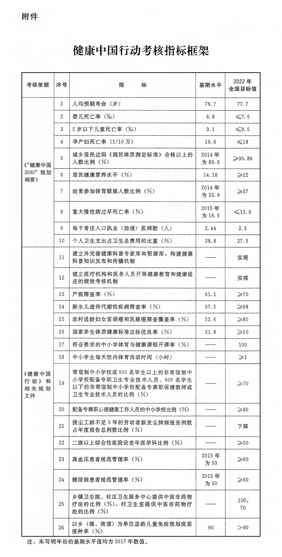 ?。ǘ┛己藘?nèi)容。圍繞健康中國建設主要目標任務要求,同時兼顧數(shù)據(jù)的可獲得性,建立相對穩(wěn)定的考核指標框架(見附件)。各?。▍^(qū)、市)在對下一級進行考核時,可根據(jù)本地實際情況對考核指標進行調(diào)整完善。