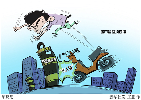 漫畫:須反思 近日,一位鄭州市民騎電動(dòng)車撞上隔離樁受傷,經(jīng)搶救無(wú)效死亡。記者在鄭州采訪了解到,醫(yī)院曾接診過(guò)很多撞隔離樁的受傷者,有的破皮流血,有的刺穿腳掌,有的摔斷腿骨。隔離樁變“傷人樁”警示城市管理不能任性粗放,應(yīng)堅(jiān)持以人為本,要像繡花一樣精細(xì),否則害民不淺。新華社發(fā) 王鵬 作