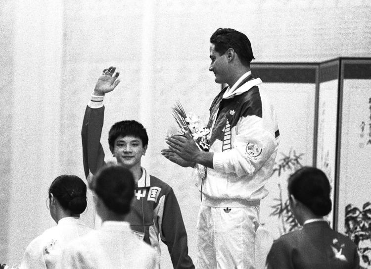 1989年5月7日,中國(guó)選手熊倪奪得第六屆世界杯跳水賽男子十米跳臺(tái)跳水冠軍。上圖是他在比賽中,下圖是他在領(lǐng)獎(jiǎng)臺(tái)上。新華社記者 韓居策 攝