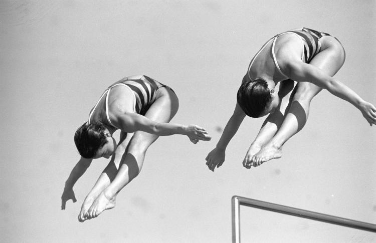 1995年5月14日,熊敏和郭晶晶(左)在美國(guó)佛羅里達(dá)州勞德代爾堡舉行的“阿拉莫國(guó)際跳水系列大獎(jiǎng)賽”美國(guó)站比賽中。新華社記者 宋曉剛 攝