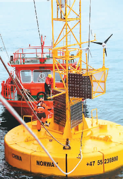 2012年8月4日,中國(guó)科考隊(duì)員在挪威海域布放中國(guó)首個(gè)極地大型海洋觀測(cè)浮標(biāo)。新華社發(fā)