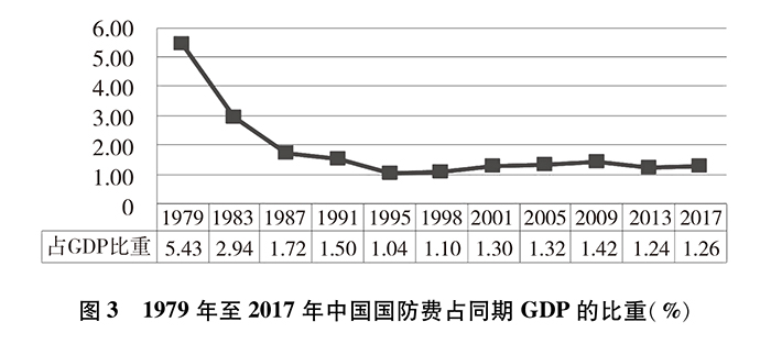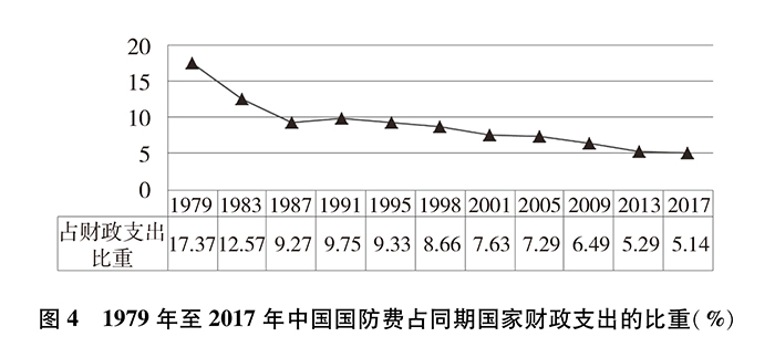 改革開放以來(lái),中國(guó)國(guó)防開支經(jīng)歷了從維持性投入到適度增長(zhǎng)的發(fā)展歷程,總體保持與國(guó)家經(jīng)濟(jì)和財(cái)政支出同步適度協(xié)調(diào)增長(zhǎng)。國(guó)防費(fèi)占國(guó)內(nèi)生產(chǎn)總值(GDP)比重從1979年最高的5.43%下降到2017年的1.26%,近30年一直保持在2%以內(nèi)。1979年國(guó)防費(fèi)占國(guó)家財(cái)政支出比重為17.37%,2017年為5.14%,下降超過(guò)12個(gè)百分點(diǎn),總體下降趨勢(shì)明顯。