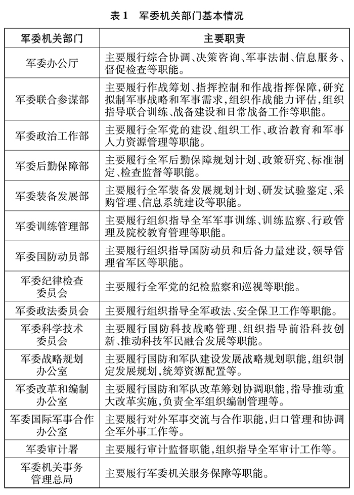 調(diào)整組建新的軍委機(jī)關(guān)部門。優(yōu)化軍委機(jī)關(guān)職能配置和機(jī)構(gòu)設(shè)置,由過(guò)去的總參謀部、總政治部、總后勤部、總裝備部四總部調(diào)整為軍委機(jī)關(guān)15個(gè)職能部門,作為軍委集中領(lǐng)導(dǎo)的參謀機(jī)關(guān)、執(zhí)行機(jī)關(guān)、服務(wù)機(jī)關(guān)。指揮、建設(shè)、管理、監(jiān)督等路徑更加清晰,決策、規(guī)劃、執(zhí)行、評(píng)估等職能配置更加合理。