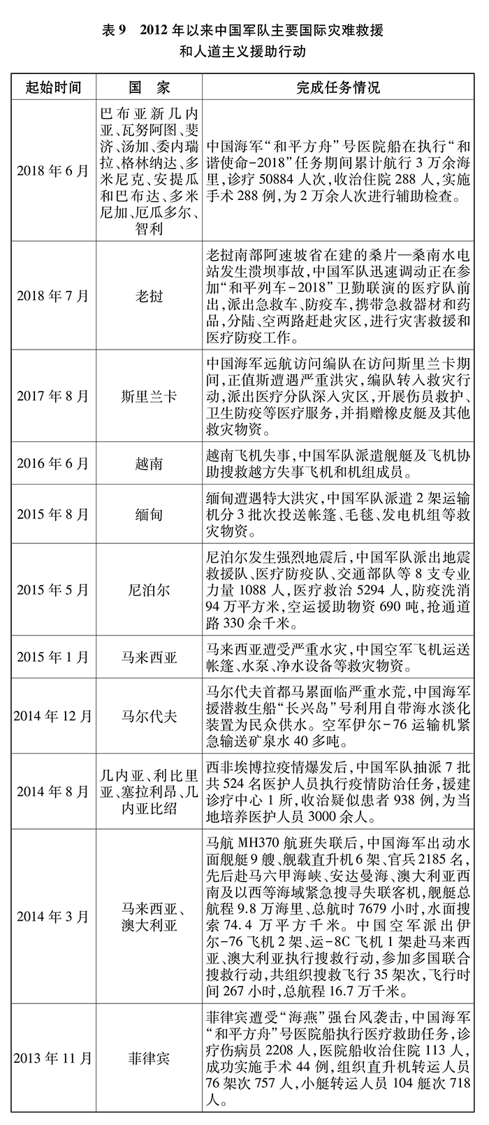 中國(guó)軍隊(duì)積極參加國(guó)際災(zāi)難救援和人道主義援助,派遣專業(yè)救援力量赴受災(zāi)國(guó)救援減災(zāi),提供救援物資和醫(yī)療救助,加強(qiáng)救援減災(zāi)國(guó)際交流。2012年以來(lái),組織或參加馬航MH370失聯(lián)航班搜救、菲律賓“海燕”臺(tái)風(fēng)救援、抗擊西非埃博拉疫情、馬爾代夫水荒救援、尼泊爾抗震救災(zāi)、老撾水災(zāi)潰壩救援等多項(xiàng)行動(dòng)。中國(guó)海軍“和平方舟”號(hào)醫(yī)院船服役10年來(lái),執(zhí)行7次“和諧使命”任務(wù),共訪問(wèn)43個(gè)國(guó)家,為到訪國(guó)民眾提供醫(yī)療服務(wù),組織醫(yī)學(xué)交流,惠及民眾23萬(wàn)余人次。