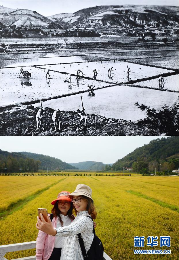 這是一張拼版照片,上圖為抗戰(zhàn)時(shí)期延安南泥灣的生產(chǎn)場(chǎng)景(資料圖片);下圖為2018年9月12日,游客在延安南泥灣稻田旁留影(新華社記者劉瀟攝)。新華社發(fā)