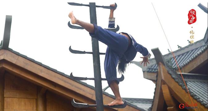 在仡佬族儺戲當中,還有一種不可缺少的民間儀式,就是上刀梯。踩著鋒利的刀梯向上攀行、一雙赤腳卻毫發(fā)無損。這也是仡佬族人們祈福孩子平安順利成長的一種方式。