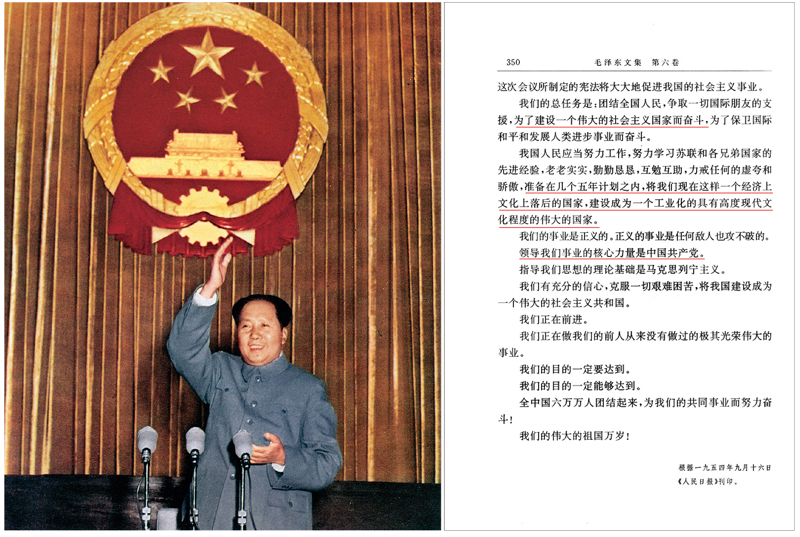 毛澤東同志在1954年第一屆全國人民代表大會(huì)第一次全體會(huì)議致開幕詞時(shí)宣布:準(zhǔn)備在幾個(gè)五年計(jì)劃之內(nèi),將我國“建設(shè)成為一個(gè)工業(yè)化的具有高度現(xiàn)代文化程度的偉大的國家”,強(qiáng)調(diào)“領(lǐng)導(dǎo)我們事業(yè)的核心力量是中國共產(chǎn)黨”。左圖為毛澤東同志在第一屆全國人大第一次會(huì)議上致開幕詞;右圖為毛澤東同志在開幕詞中的重要論述。