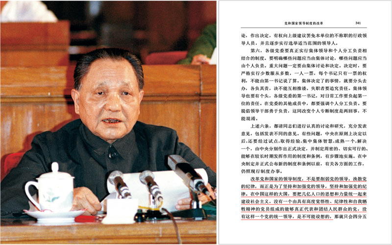 鄧小平同志高度重視堅(jiān)持和加強(qiáng)黨的領(lǐng)導(dǎo),旗幟鮮明地指出中國共產(chǎn)黨是社會(huì)主義現(xiàn)代化事業(yè)的領(lǐng)導(dǎo)核心,在改革開放和現(xiàn)代化建設(shè)中,必須始終堅(jiān)持黨的領(lǐng)導(dǎo),加強(qiáng)和改進(jìn)黨的建設(shè)。左圖為鄧小平同志在中國共產(chǎn)黨第十二次全國代表大會(huì)上致開幕詞(新華社記者 錢嗣杰/攝);右圖為鄧小平同志有關(guān)堅(jiān)持和加強(qiáng)黨的領(lǐng)導(dǎo)的重要論述。