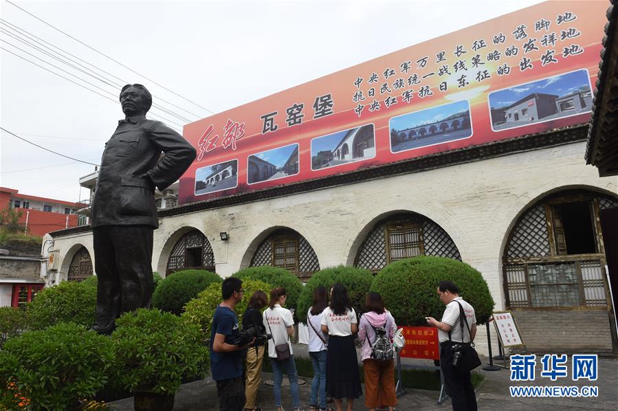參加“記者再走長征路”活動(dòng)的記者在陜西省子長縣瓦窯堡革命舊址采訪(8月9日攝)。新華社記者 羅曉光 攝