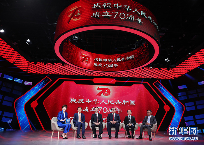 8月22日上午,由中央宣傳部、中央和國家機(jī)關(guān)工委、中央軍委政治工作部、北京市委聯(lián)合主辦,人民網(wǎng)、新華網(wǎng)、央視網(wǎng)承辦的慶祝中華人民共和國成立70周年系列論壇第二場在新華網(wǎng)媒體創(chuàng)意工場MR智能演播室舉行。圖為企業(yè)家與網(wǎng)友互動(dòng)。新華網(wǎng) 焦鵬 攝