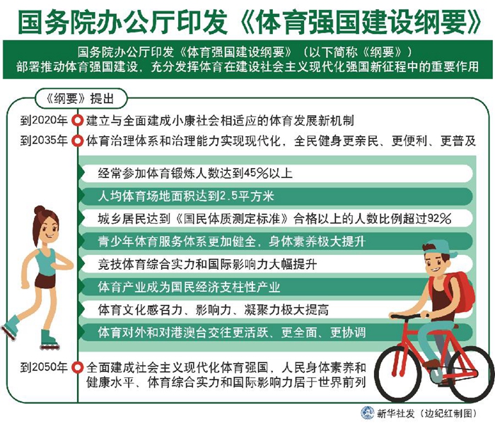 新華社北京9月2日電 近日,國務(wù)院辦公廳印發(fā)《體育強(qiáng)國建設(shè)綱要》(以下簡稱《綱要》),部署推動(dòng)體育強(qiáng)國建設(shè),充分發(fā)揮體育在建設(shè)社會(huì)主義現(xiàn)代化強(qiáng)國新征程中的重要作用。