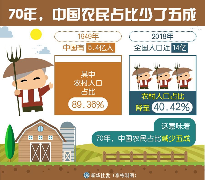 1949年中國有5.4億人,其中農村人口占比89.36%;2018年,全國人口已近14億,農村人口占比卻降至40.42%。這意味著,70年,中國農民占比減少五成。