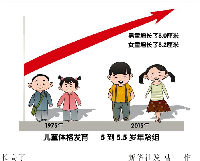 國(guó)家衛(wèi)健委一項(xiàng)針對(duì)9市7歲以下兒童體格發(fā)育的調(diào)查也印證了這條“曲線”:從1975年到2015年,我國(guó)兒童身高、體重指標(biāo)均持續(xù)快速增長(zhǎng)。以最具代表性的5到5.5歲年齡組為例,男童和女童身高分別增長(zhǎng)了8.0厘米和8.2厘米。