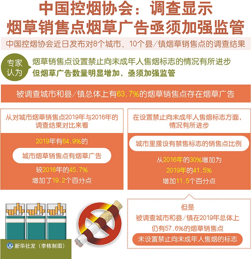 中國控煙協(xié)會副會長廖文科說,未成年人保護法中有“經(jīng)營者應當在顯著位置設置不向未成年人出售煙酒的標志”的規(guī)定,亟須進一步加強監(jiān)管,堅決取締違法煙草廣告。