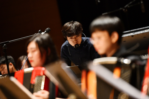 6月16日,在天津大劇院,樂團(tuán)成員李宏基(中)用電子呼吸控制器演奏曲目。 李然 攝