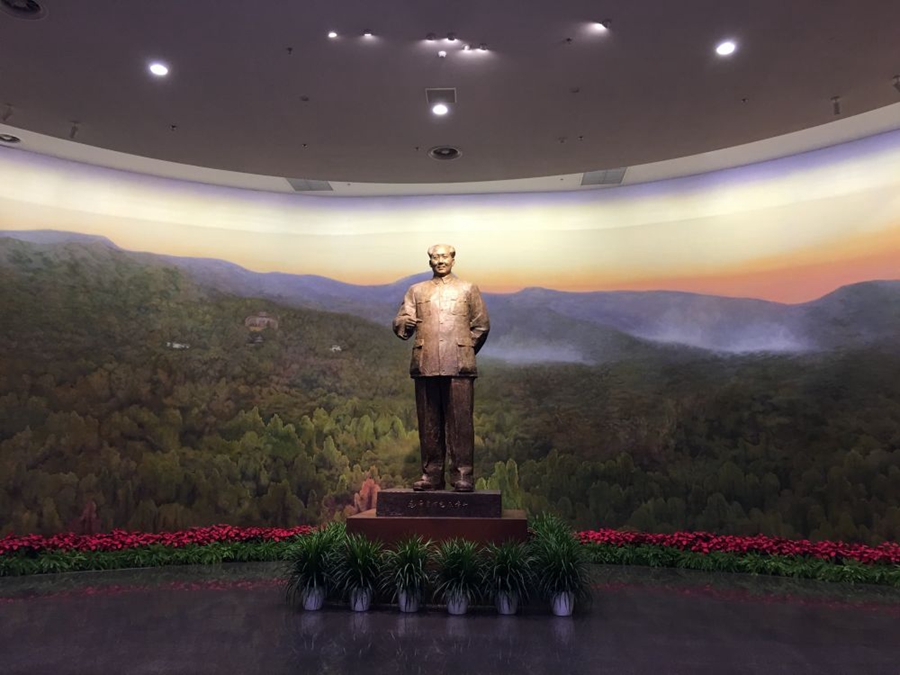 展覽序廳,矗立著高達3.8米的毛澤東主席雕塑,兩側(cè)的大型浮雕,刻畫了1949年的兩大標(biāo)志性歷史事件: