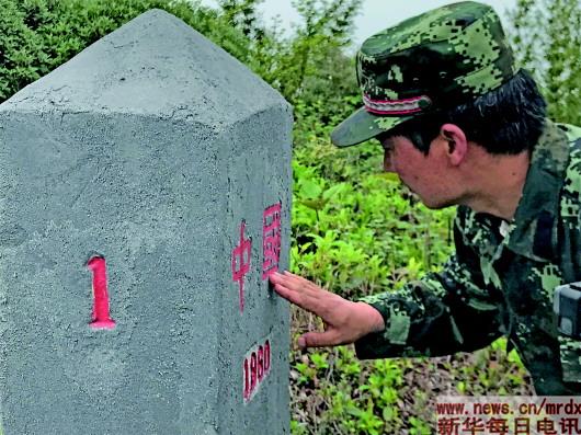 “第一次見到界碑時,特別激動,看到‘中國’二字,特別自豪!”在同伴的帶領(lǐng)下,蔡新裝用了半天時間爬到山頂,他快步上前,撫摸著碑身,擦拭著界碑上的字符,在擦拭“中國”二字時特別用心。然后仔細(xì)查看界碑周圍的情況,用砍刀修剪草叢,還用手機拍下一張界碑的照片。